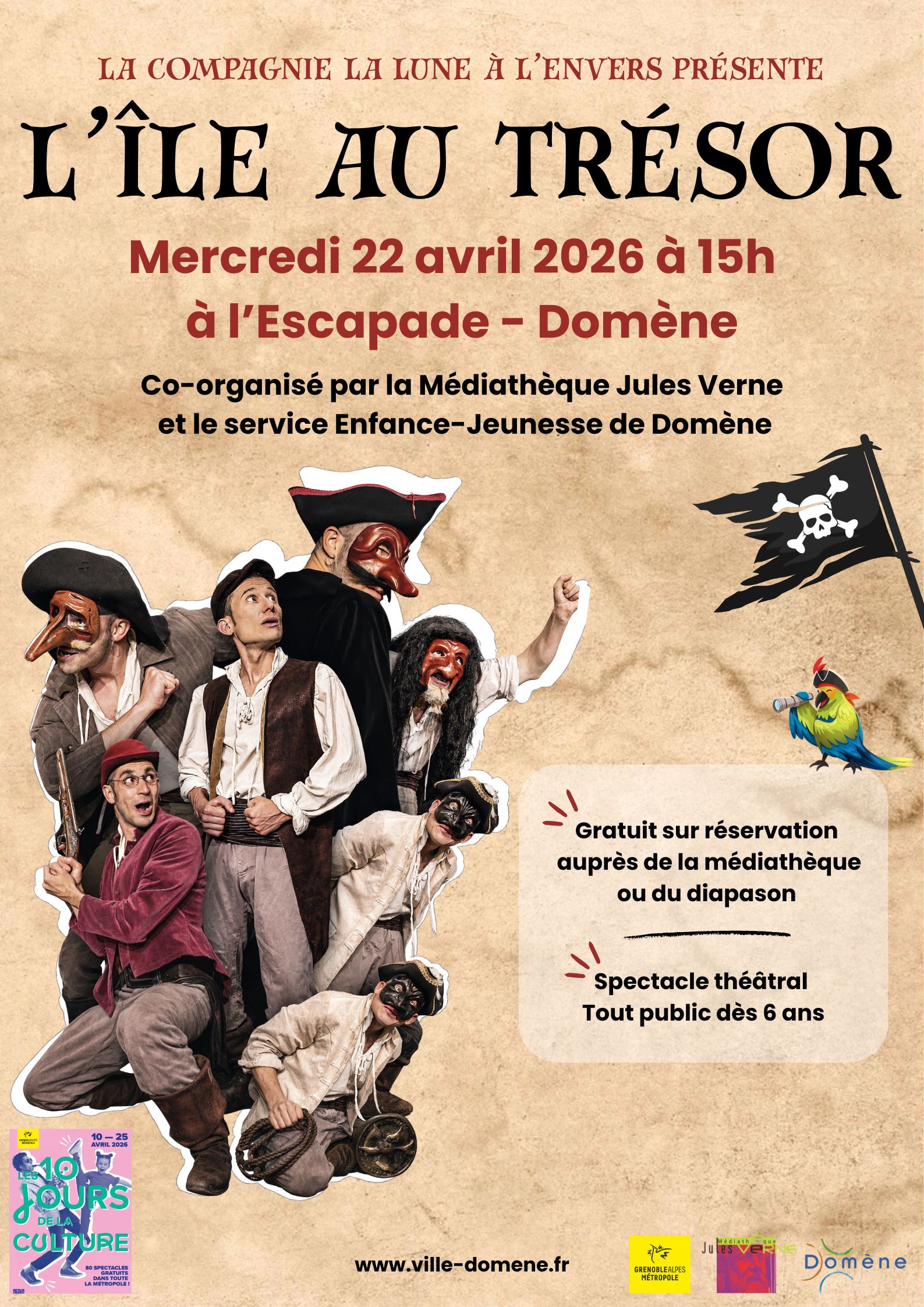 L’île au trésor : une histoire avec des pirates sanguinaires, des héros au grand cœur, des amitiés, des trahisons, du rhum… et de l’aventure ! Le spectacle narre l’épopée du jeune Jim Hawkins, garçon rêveur travaillant à longueur de journée dans l’auberge de ses parents.